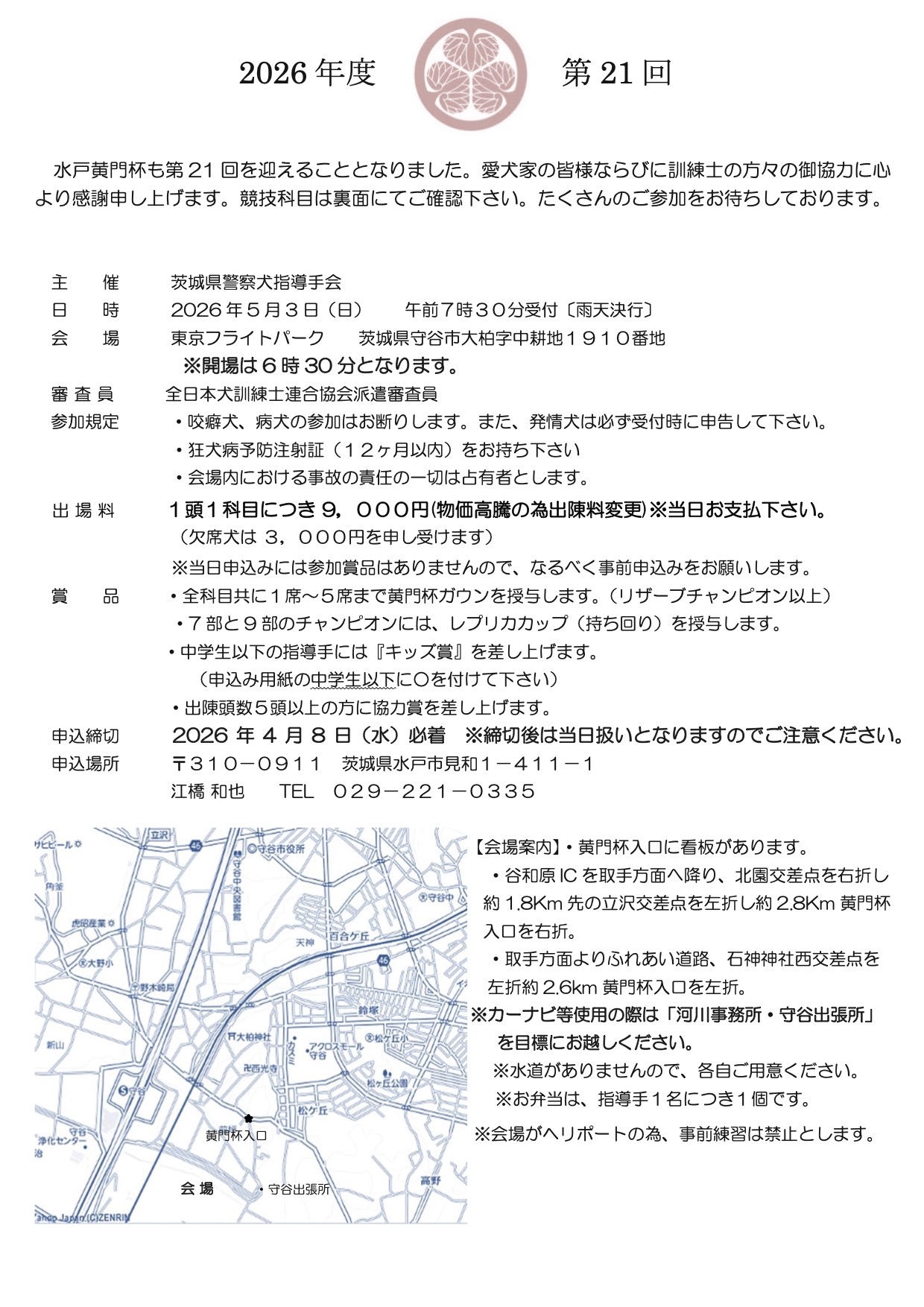 2026年5月3日(日)に茨城県警察犬指導手会主催の第21回水戸黄門杯争奪訓練競技大会が開催されます。 ご案内を掲載いたしますので、是非ご参加ください。 申込用紙は下記リンクよりダウンロードしてください。