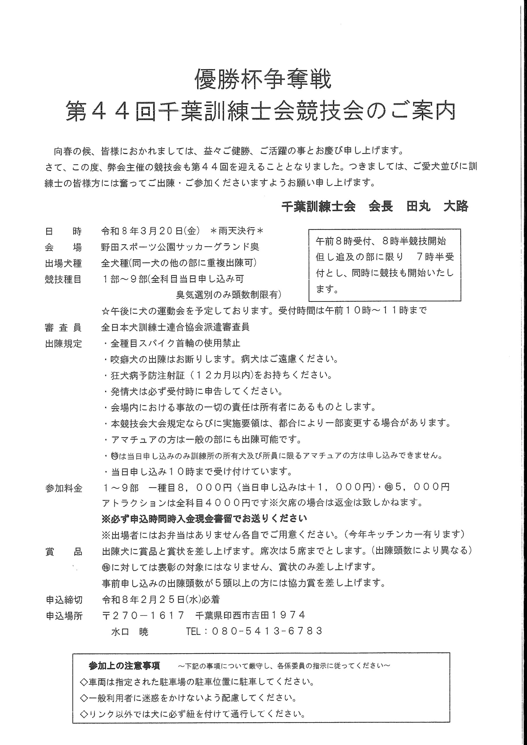 2026年3月20日(金・祝)に千葉訓練士会主催の第44回千葉訓練士会競技会が開催されます。 ご案内を掲載いたしますので、是非ご参加ください。 申込用紙は下記リンクよりダウンロードしてください。